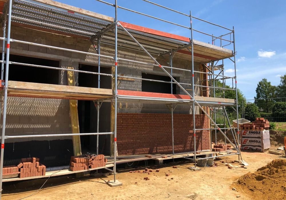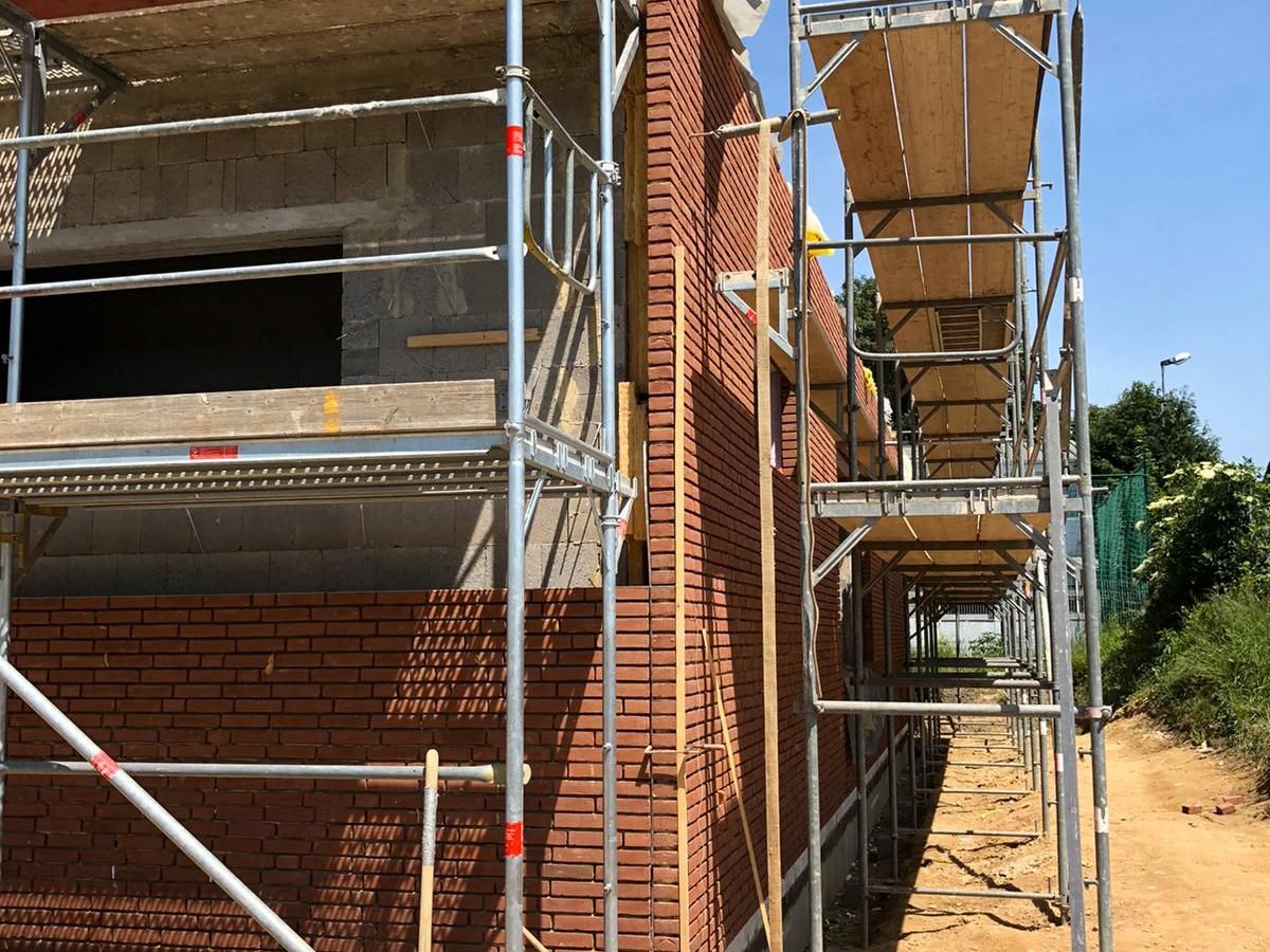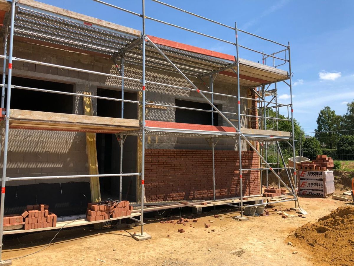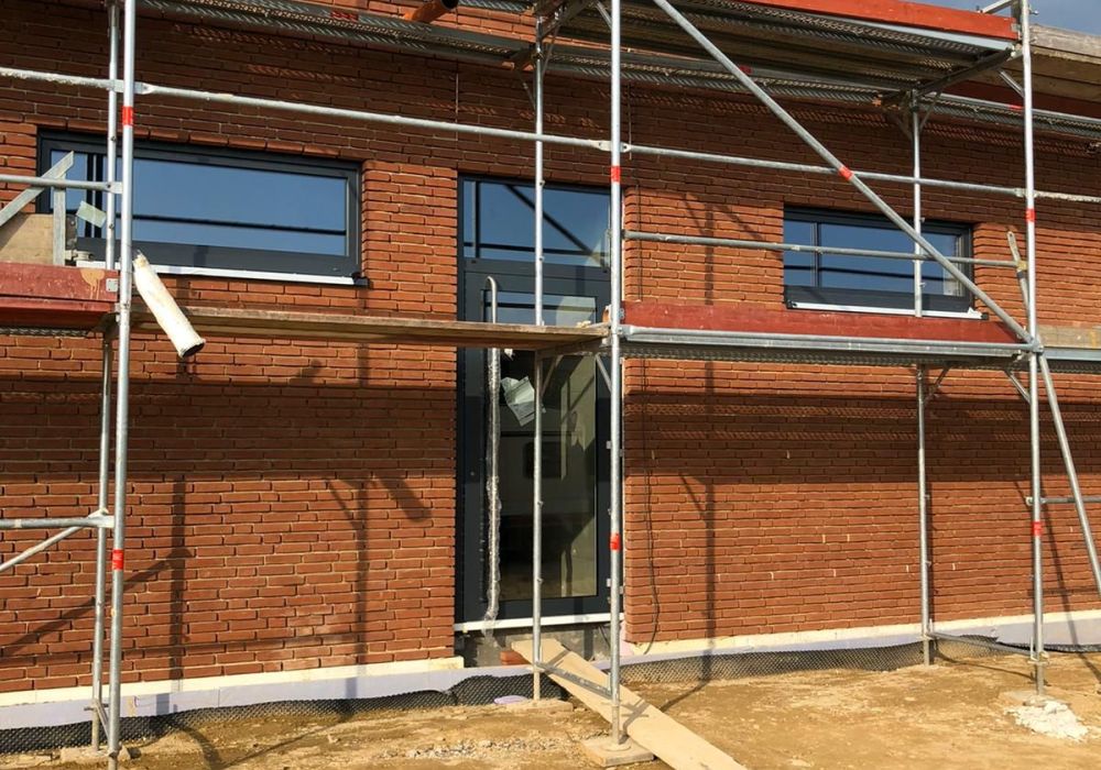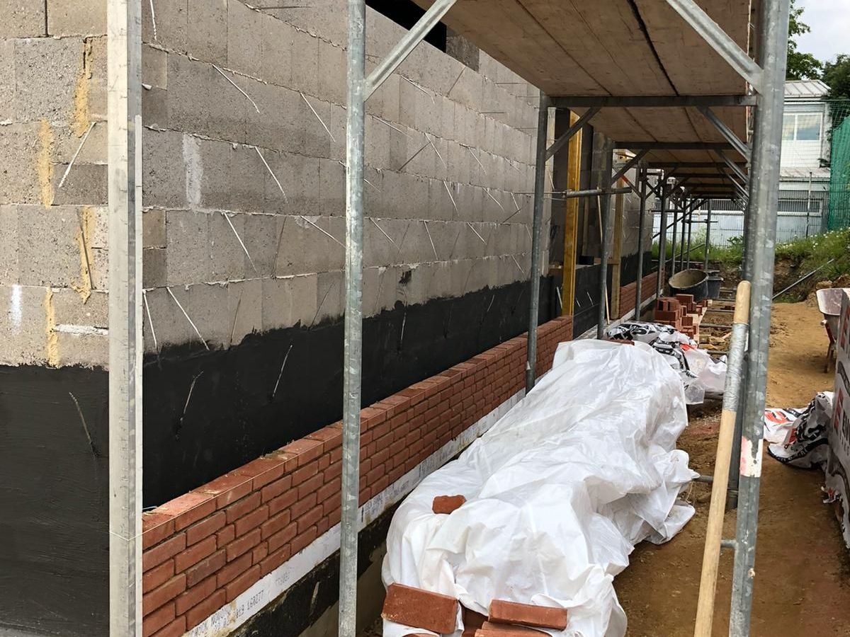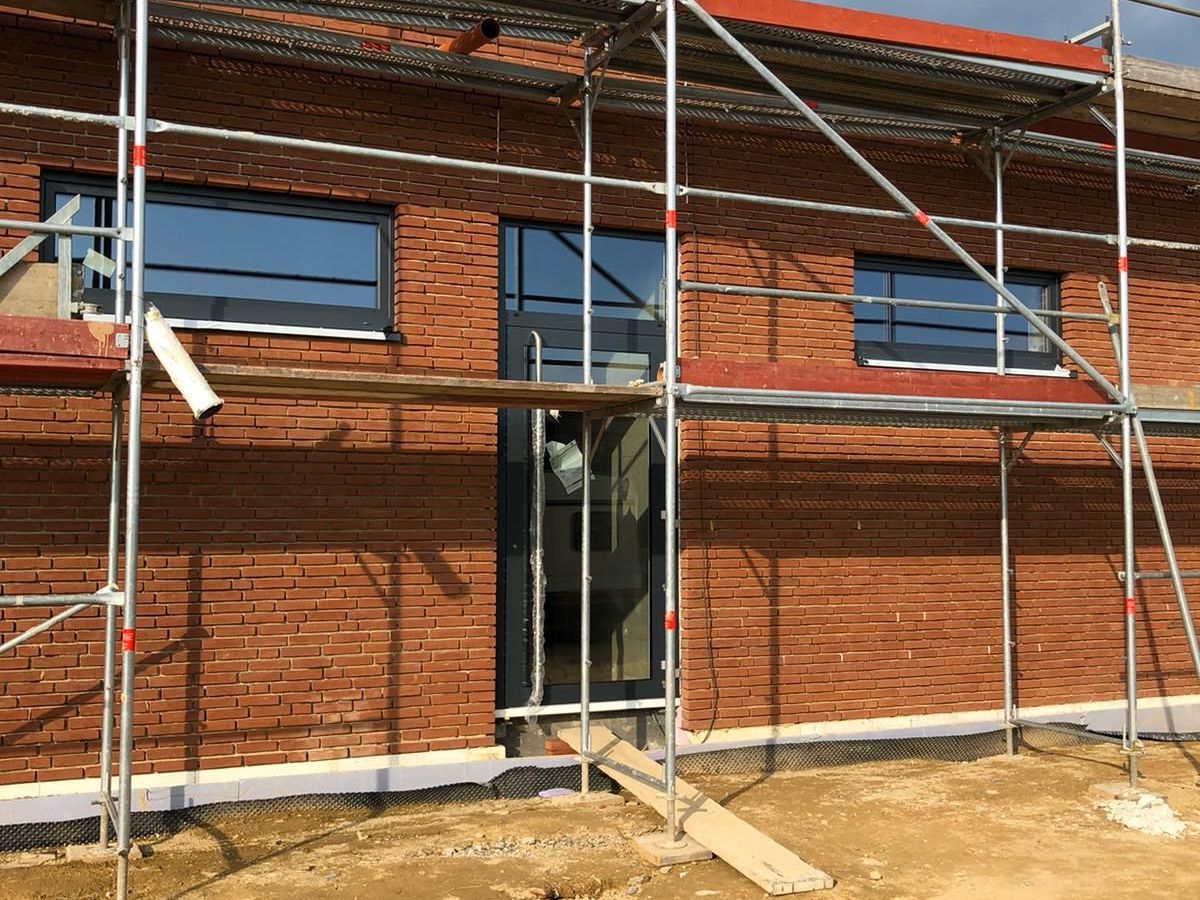 Nachdem der Rohbau steht, geht es außen und oben weiter. Die Maurer versehen den Anbau mit einer Klinkerfassade und die Dachdecker sorgen dafür, dass von oben kein Wasser mehr ins Gebäude gelangt.