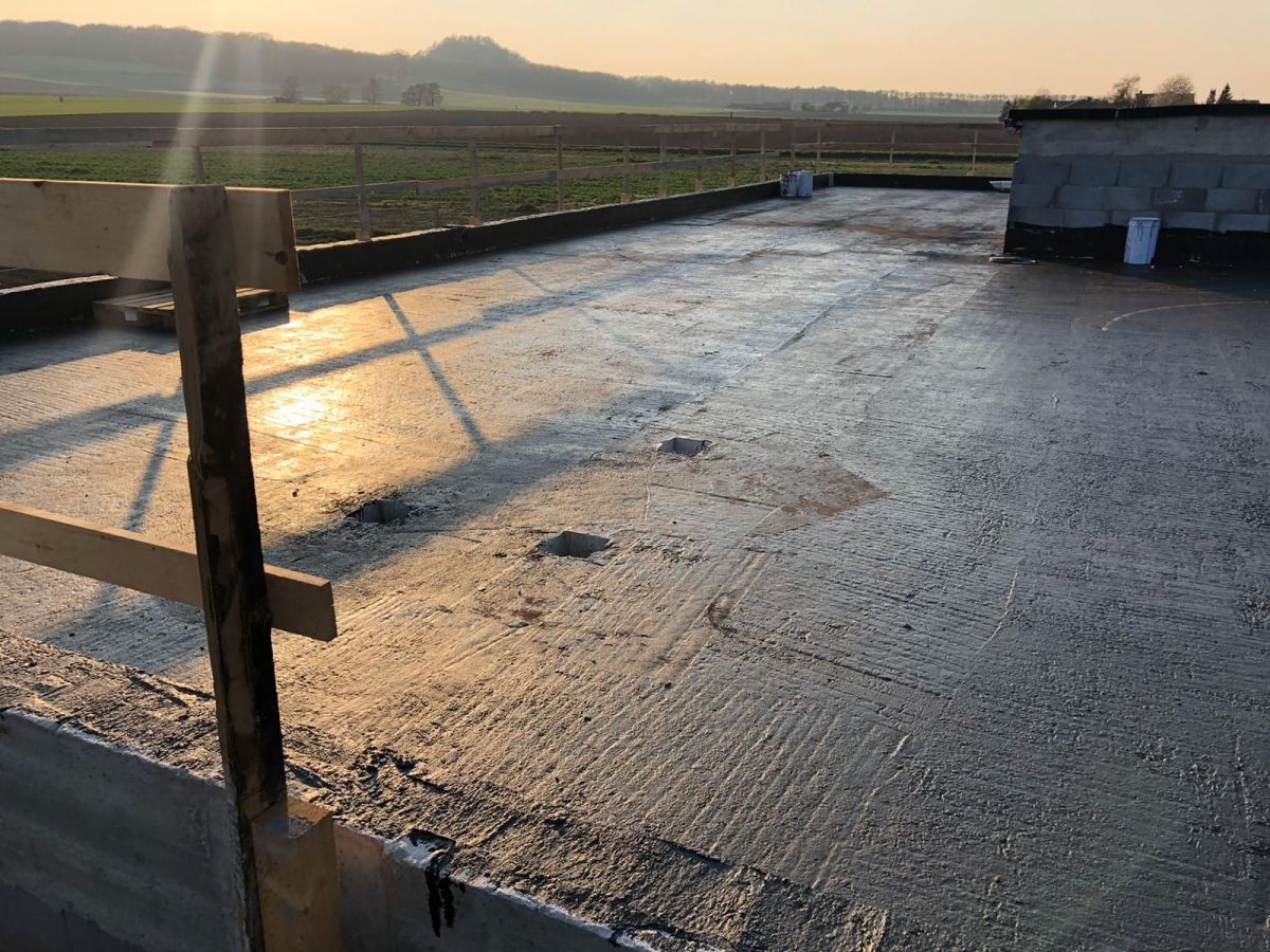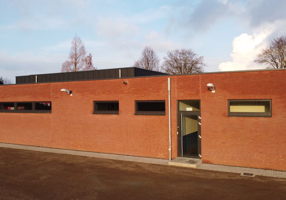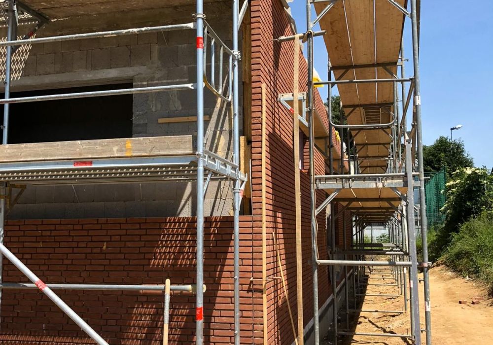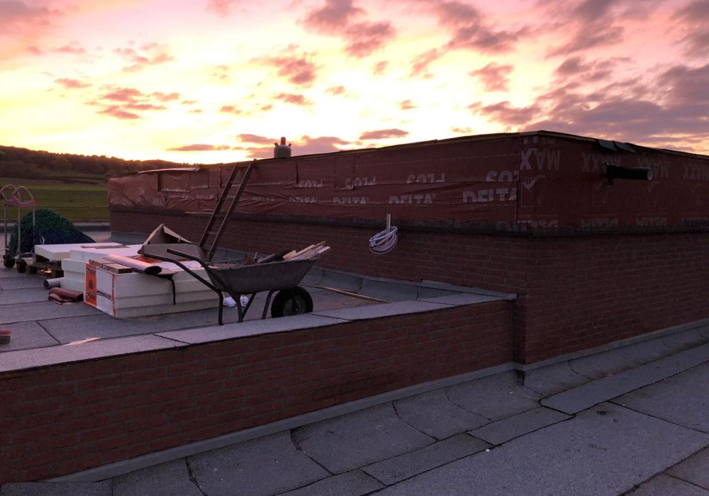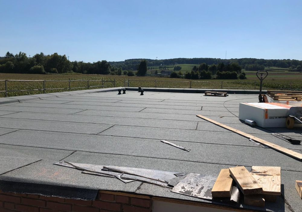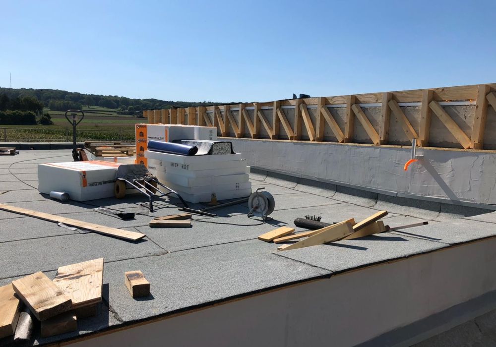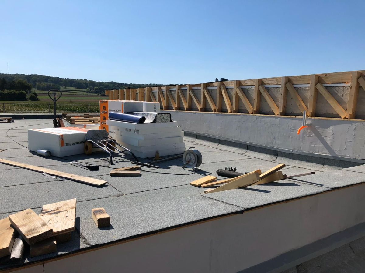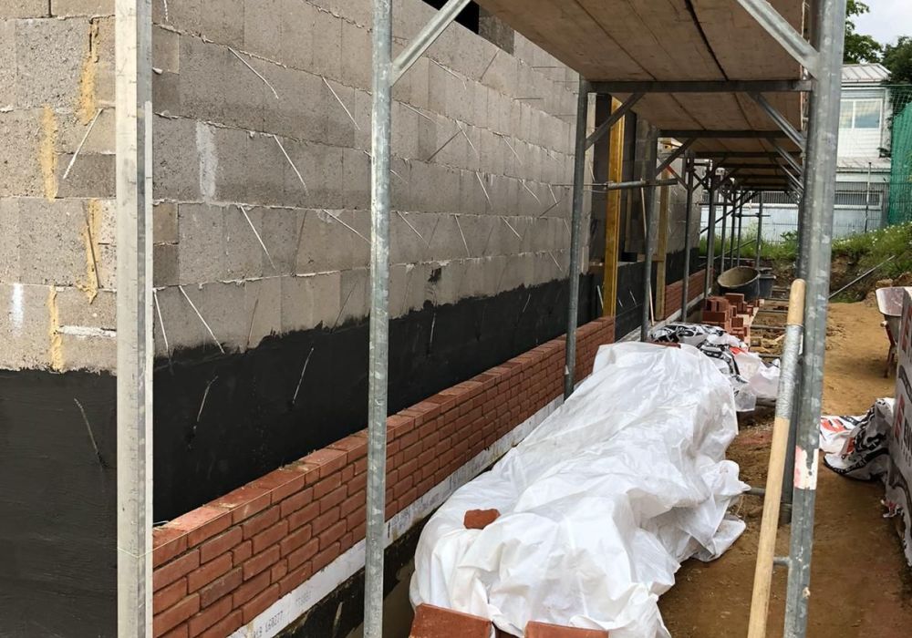 Nachdem der Rohbau steht, geht es außen und oben weiter. Die Maurer versehen den Anbau mit einer Klinkerfassade und die Dachdecker sorgen dafür, dass von oben kein Wasser mehr ins Gebäude gelangt.